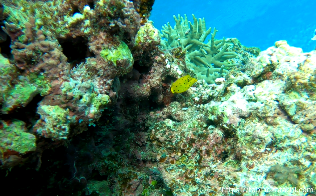 途中、レアキャラで、皆のアイドル ミナミハコフグの赤ちゃんにも遭遇! 臆病ですぐに逃げちゃうのですが、黄色に黒の点々がかわいすぎるーーーー!