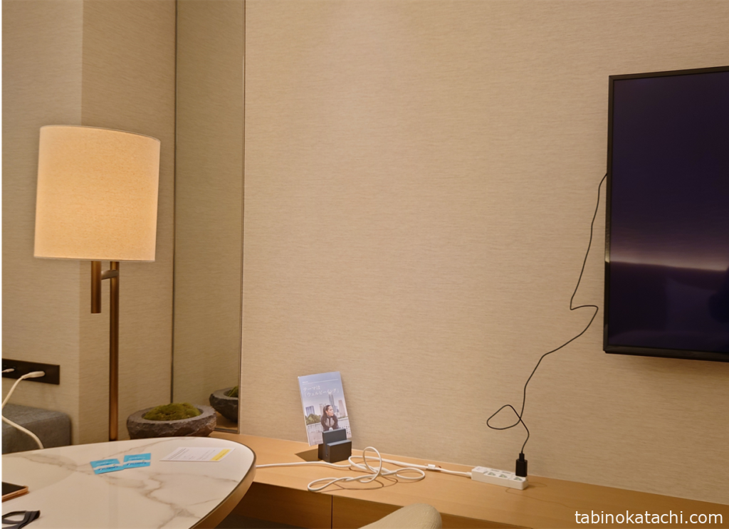 少し驚いた点は、冷蔵庫が空だったことです。このクラスのホテルでは、ドリンクの用意があると思っていたので、意外でした。お部屋でお飲み物を楽しみたい場合は、持参必須です。近所のコンビニはありますが、休日だとオフィスに入っているコンビニはクローズしているところもあるので注意が必要です。