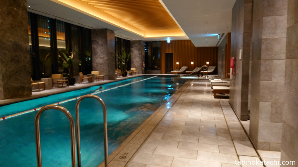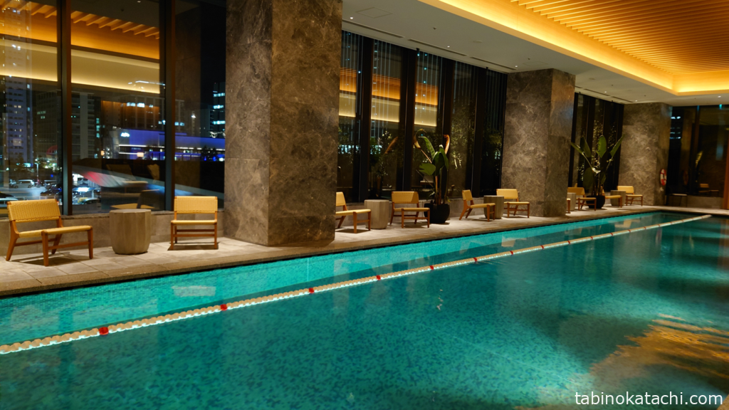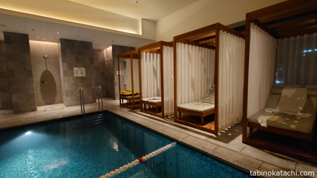 こちらがプールです。3レーン分の横幅があり、実際にレーンが設置されているのは1つのみです。周囲にチェアやリクライニングチェアが配置されていて、プール横にジャグジーも併設されています。昼間は日の光が、夜は夜景をみながら楽しむことができました。