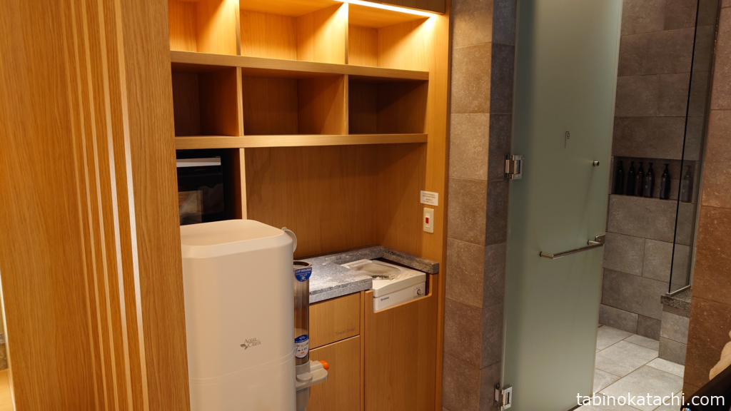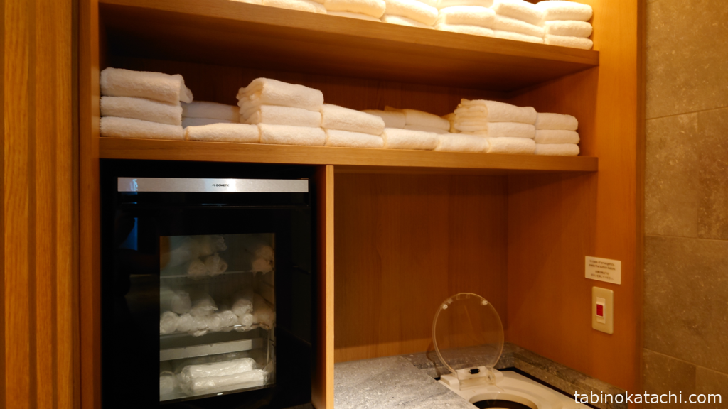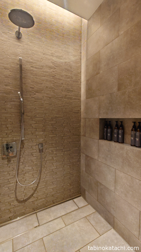広めのシャワールームは、たしか2ブースあったと思います。お部屋と同じWHITE TEAのシャンプー、コンディショナーで、プール上がりに使うことも、ジムの後に利用することも可能になっています。シャワールームの横には、冷たいおしぼり、タオル、水着の脱水用マシーンと十分な設備がそろっています。水着の脱水マシーンは便利ですね!