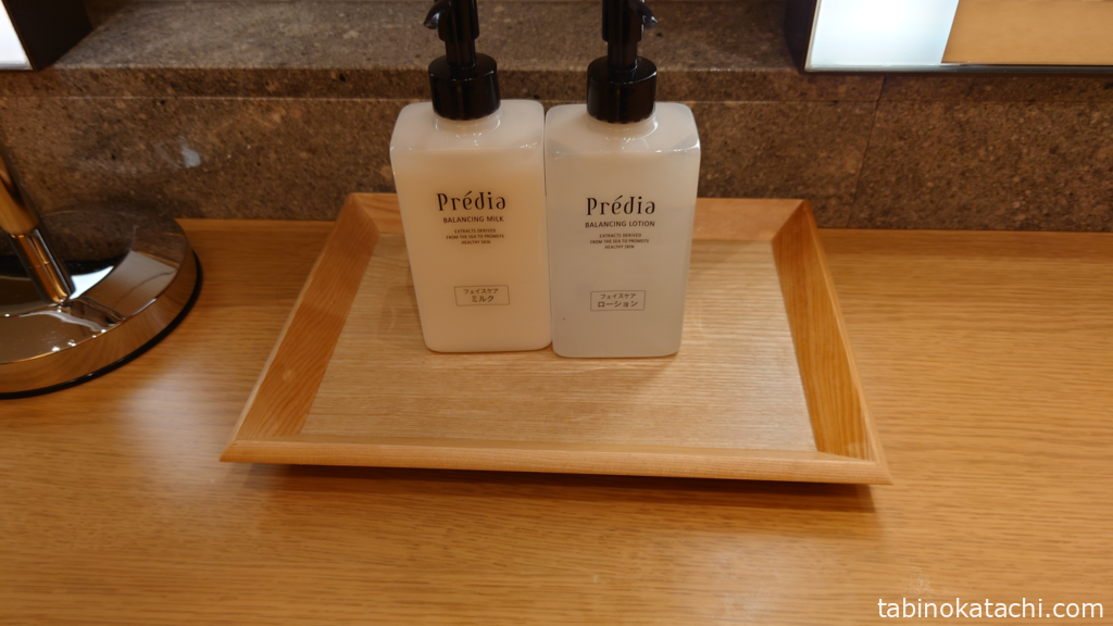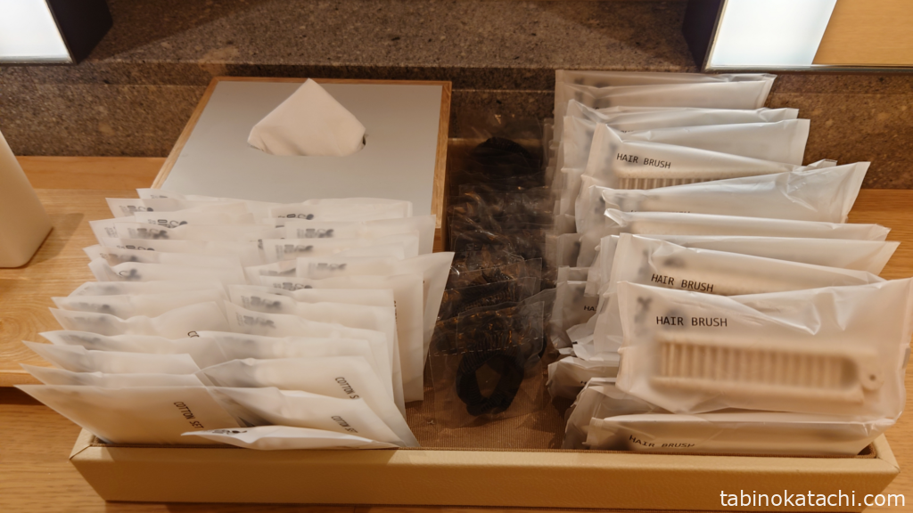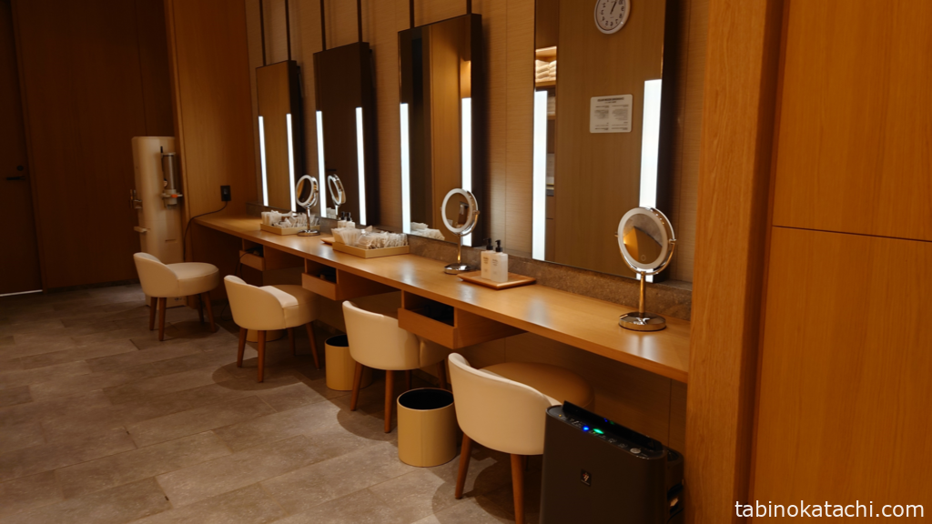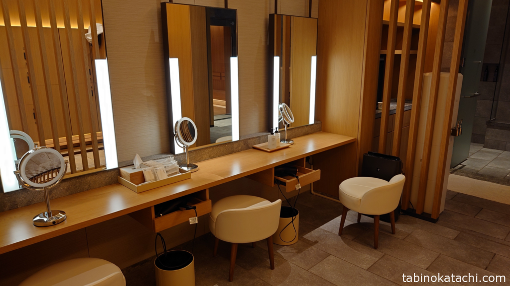 ロッカーと反対側が、パウダールームになっていて、基礎化粧品、ドライヤー、ブラシ、髪留めなどがそろっています。ドレッサーは4席あり、お部屋に帰ってシャワーされる方も多いようで、全部埋まっていることは、ありませんでした。あたたかみのあるデザインで、素敵♪