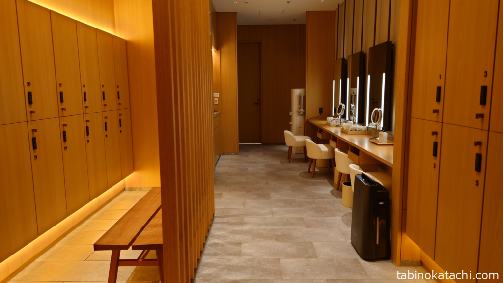 更衣室には、暗証番号式のロッカーがずらっと、壁際に並んでいて、ちょっと荷物をおいたり、腰掛けられるベンチもあって便利です。373室のホテル規模ですので、チェックイン後の時間帯は結構埋まっていましたが、お部屋で着替えて、バスローブで更衣室まできて、サクッと荷物だけ置いて行かれるかたも多いようにみえました。
