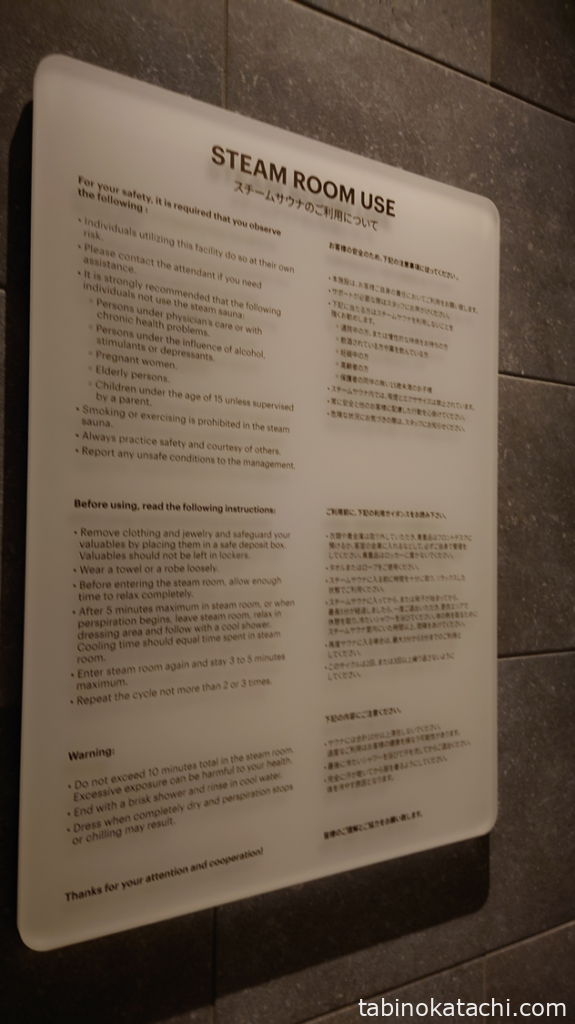 ちなみに・・・滞在中、ちょっとした事件が。あめおくんが、サウナに入っていた時、水着の女性の方が入ってこられたそうなんです。男性側のサウナ室に入るには、プールサイドから男性更衣室向けの扉を開けてでないと、入ってこれないようになっています。その時、サウナの中には複数の男性がいて、それもわかって入室されたようなので、おそらく、ドライサウナを利用したくて入ってこられたかと・・・・。初めてだったので、ルールがわからず、「もしかして、サウナまでは異性もOKなの?」と思い、あとでプールのレセプションの方に確認したところ、やはり、男性サウナへの女性の入室はお断り(逆も然り)とのことでした。たまたま、男性も水着だったからよかったものの、水着着用でない方もいらっしゃいますしね。あぶない、あぶない。