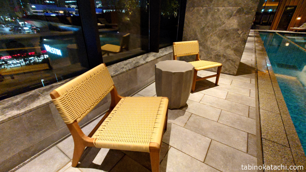 プールサイドって、最高の整いスペースです。もちろん、脱衣所にベンチなどはありますが、着替えをされるかたもいらっしゃいますし、せっかくプールがあるのですから!今のところ、ホテルに水着のレンタルは用意がないようですし、サウナ―の方には、水着持参を超絶オススメします。プールサイドから、5階にあるガーデンにも出られるようになっていますが、外にベンチはないので、ちょっとお散歩で外気浴程度になるとおもいます。
